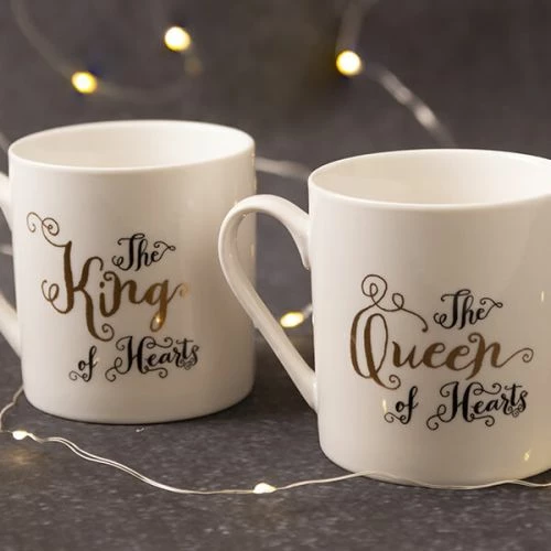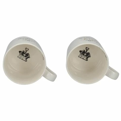 The mug for him is styled in a matching way with the King on one side and curving ‘The King of Hearts’ calligraphy on the other, while the inside of the mug instructs, ‘Don’t be impertinent’ and his crown is also patterned on the base.