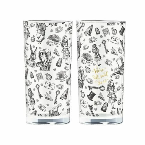 - Bring the magic of Wonderland to your table with this set of 2 high ball glasses, featuring iconic Alice In Wonderland designs. Perfect for tea parties, cocktails, or everyday use.