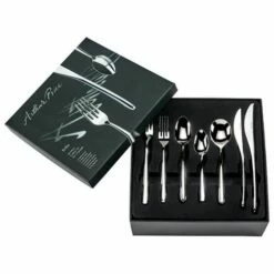 Set includes: 12 tables knives, 12 table forks, 12 dessert knives, 12 dessert forks, 12 dessert spoons, 12 soup spoons and 12 teaspoons, plus FREE set of 12 teaspoons.