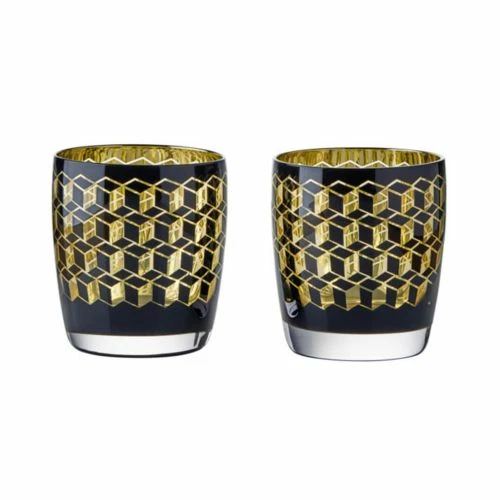 The geometric cubes patterned around the glass are a near-obsidian black, while the inside of the glass is a striking, shining gold, which is the main reason for why these glasses are so unique and beautiful.