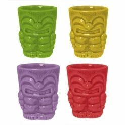 Perfect for serving classic aged rum, tequila or any short drink, this Bar Bespoke Ceramic Tiki Shots 4 Pack is great when entertaining in the home or garden. Tiki, being the Maori equivalent of Adam, dates back from the beginning of time. Tiki culture however is much more recent, having been influenced post World War II by returning American GIs who helped popularise the culture of the Pacific Islands. These coloured ceramic Tiki shot glasses reflect these original designs. These tough shot glasses are moulded into a classic Tiki shape and hold 50ml, enough for a generous shot.