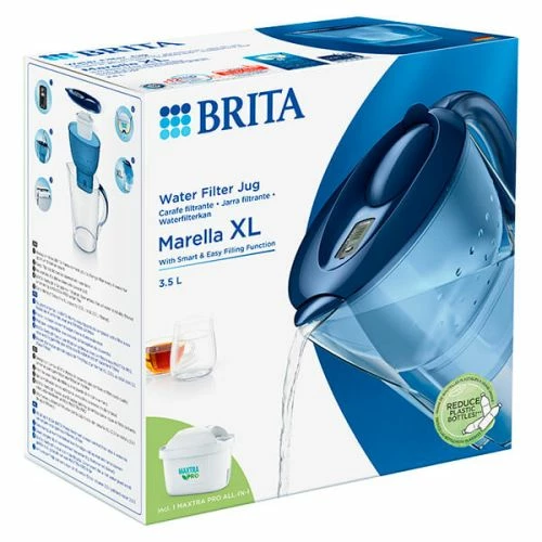 Introducing the BRITA Marella XL Blue Jug System, an eco-friendly solution for refreshing, high-quality water. This convenient set comprises a BRITA Marella water filter jug and a MAXTRA PRO ALL-IN-1 filter cartridge.