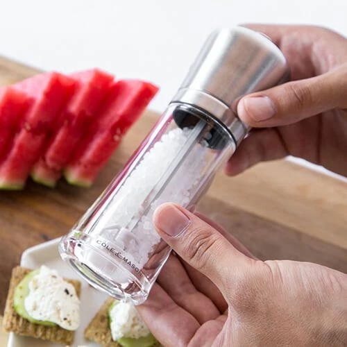 The clear acrylic body allows you to easily check on the level of peppercorns or salt inside the mill and the grind can be adjusted from fine to coarse by loosening or tightening the knob on the lid.