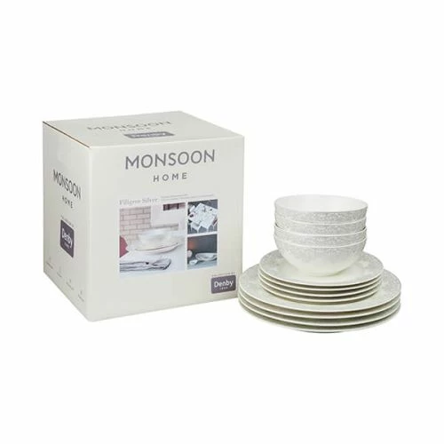 - The Denby Monsoon Filigree Silver 12 Piece Tableware Set combines timeless elegance with modern design. Each piece features intricate filigree detailing in a stunning silver finish.