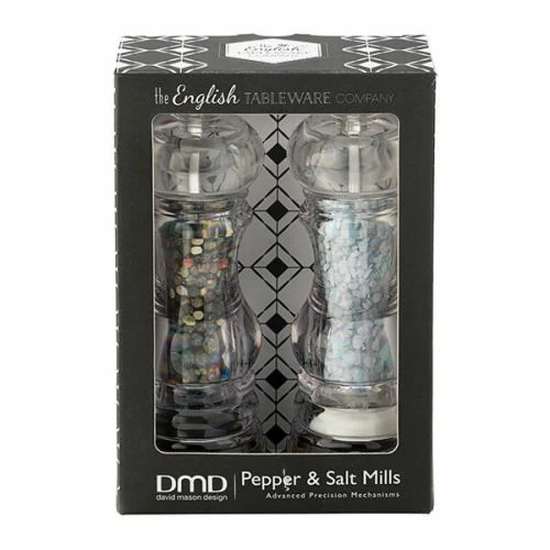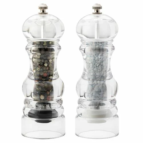 - Elevate your dining experience with the English Tableware Company President Clear Acrylic Salt & Pepper Mill Set. Crafted from high-quality acrylic, this set combines elegance and functionality for your kitchen.