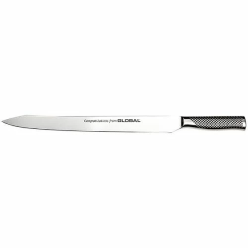 There’s an interesting story to tell regarding the Global G-26 Bride’s Wedding Cake Knife. When Michel Roux Jr contacted Global Knives to about the possibility of creating a wedding knife for his daughter’s wedding he was told the minimum order would be a dozen knives. The order was taken and two of the 12 knives were given to the Roux family. The remaining 10 are now available to the general public.