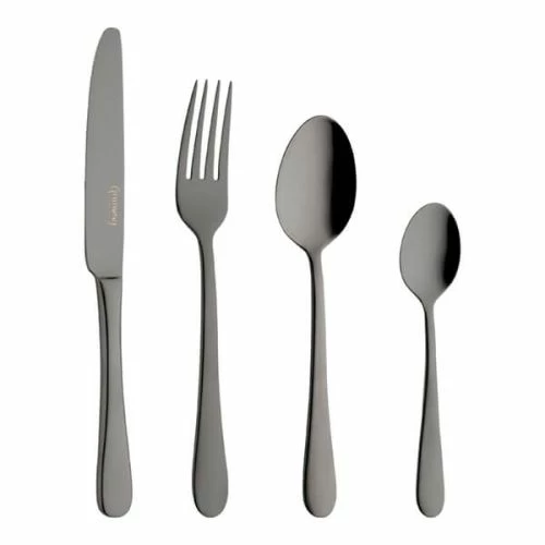 The timeless design and eye catching colour of this Grunwerg Windsor Black 16 Piece Boxed Cutlery Set adds a touch of elegance to every meal. This 4 person set includes 4x table knives, 4x table forks, 4 dessert spoons and 4x teaspoons, all crafted from quality 18/10 stainless steel and finished with a premium PVD coating. Classic Windsor styling with soft, elegant edges are given a modern twist with a luxury black polished finish.