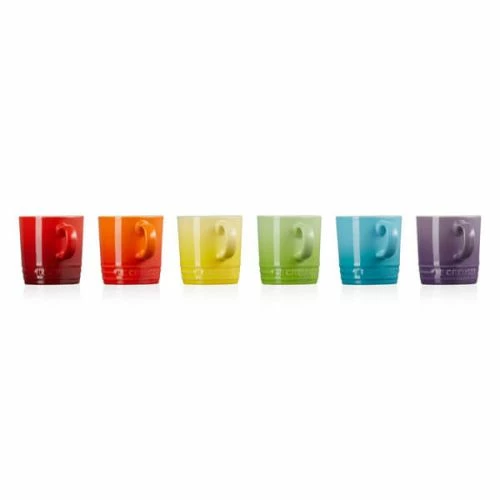- Elevate your drinkware collection with the Le Creuset Rainbow Collection Set Of 6 Mugs. Each mug features a vibrant, hand-painted finish in a spectrum of rainbow colours, adding a cheerful touch to your table.