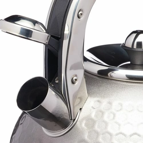Lovello Retro Shadow Grey Textured 2.5L Whistling Kettle features a textured finish with small geometric hexagons pressed in to the stainless steel surface.