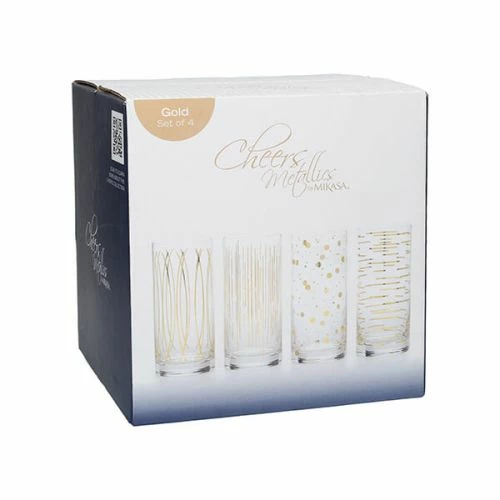 - Elevate your drinking experience with the MIKASA Cheers Metallic Gold High Ball Glasses. This set of 4 glasses combines elegance and functionality, making them perfect for any occasion.