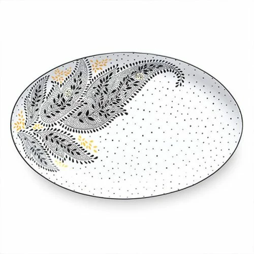 The Sara Miller Artisanne Noir Large Oval Serving Platter in Paisley brings a Middle Eastern flare to your dining room with a beautiful, unique, paisley design, decorated in a monochrome palette with gold detailing for a truly unique style.