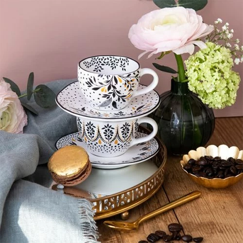 • Each set includes 2 espresso cups and 2 matching saucers, making it ideal for serving coffee to guests or enjoying a quiet moment alone. The cups are the perfect size for a rich, aromatic espresso.