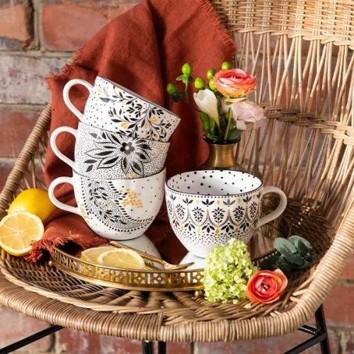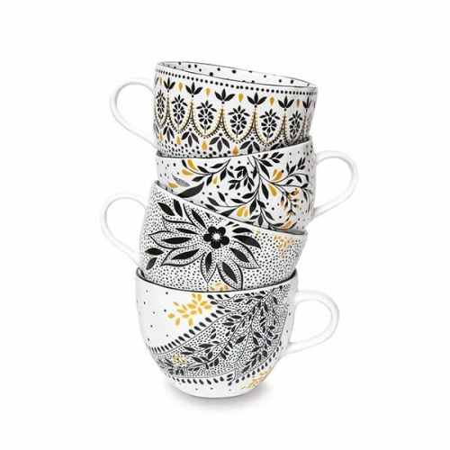 The Sara Miller Artisanne Noir Set of 4 Mugs brings a Middle Eastern flare to your kitchen and dining room with beautiful, unique, mix-and-match designs. These mugs are decorated in a monochrome palette with gold detailing for a truly unique style.