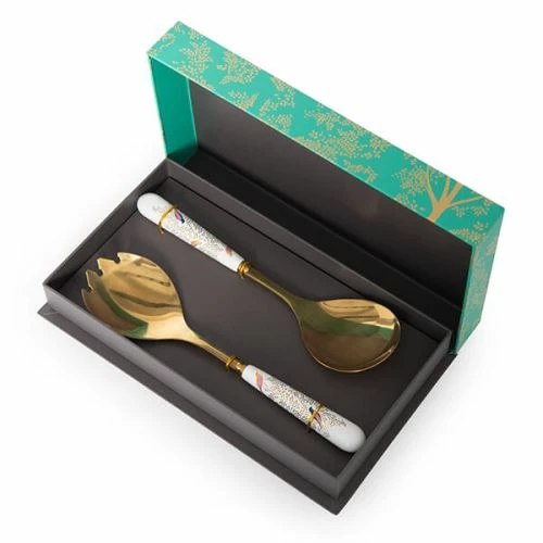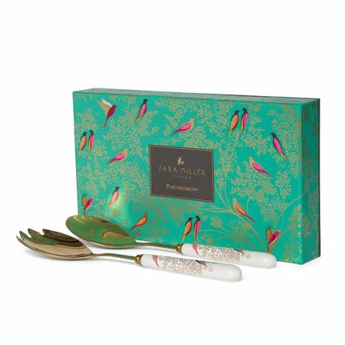 The Sara Miller Chelsea Collection Salad Servers are made from porcelain and stainless steel with a gold finish and gold leaf detailing on the handles.