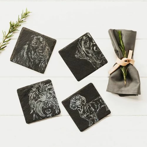Beautifully handcrafted in Scotland, the Just Slate Company Set of 4 Mixed Dog Slate Coasters make a lovely table piece for your guests to set their drinks on. Each square slate coaster has been engraved with a stunning hand-illustrated engraving of a dachshund, a cockapoo, a cocker spaniel and a labrador.