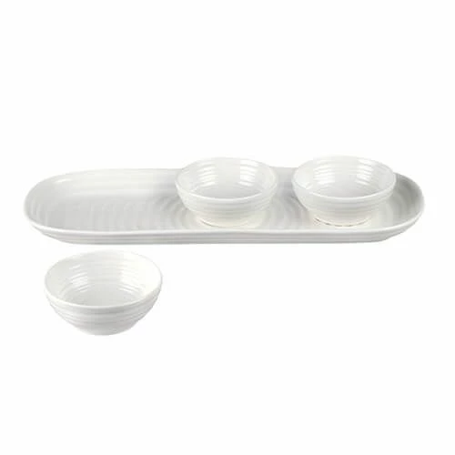 - Sophie Conran’s 3 Dip Bowls & Tray Set in white is a stylish and functional addition to your tableware collection. Perfect for serving sauces, dips, jams, and condiments.