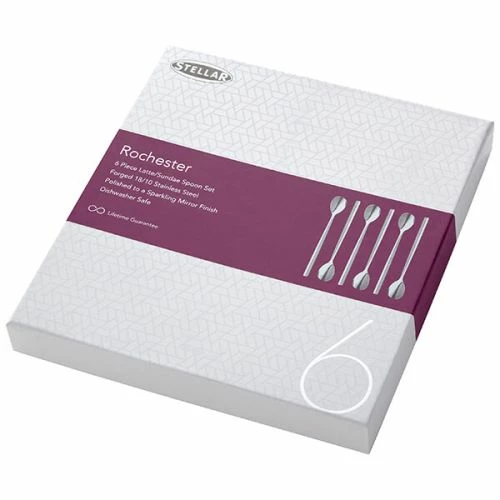 - The Stellar Rochester Polished 6 Piece Latte/Sundae Spoon Gift Box Set is a premium collection of stainless steel spoons, designed for both functionality and elegance. Perfect for serving lattes, sundaes, or desserts.